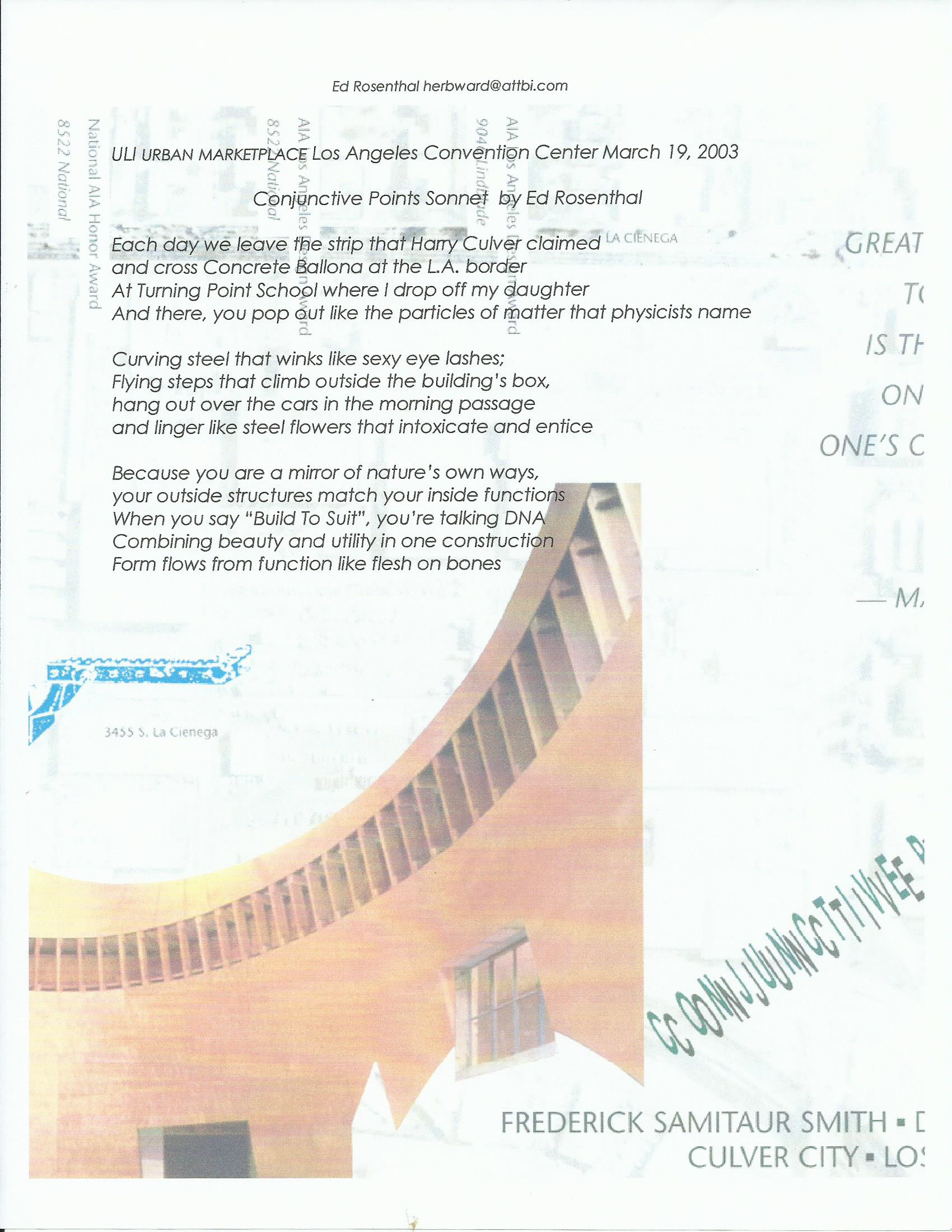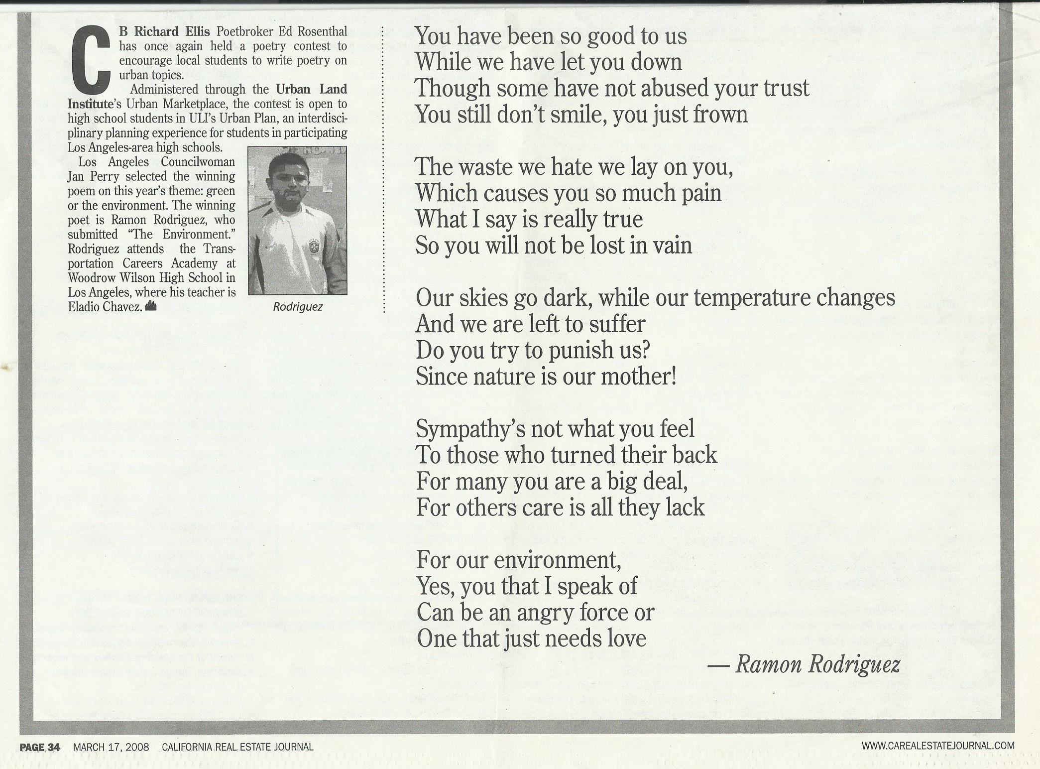 One of my favorite poems here is not by me, but by a boy named Ramon Rodriguez, the winner of an annual poetry contest I put together for four years that was administered by the Urban Land Institute.