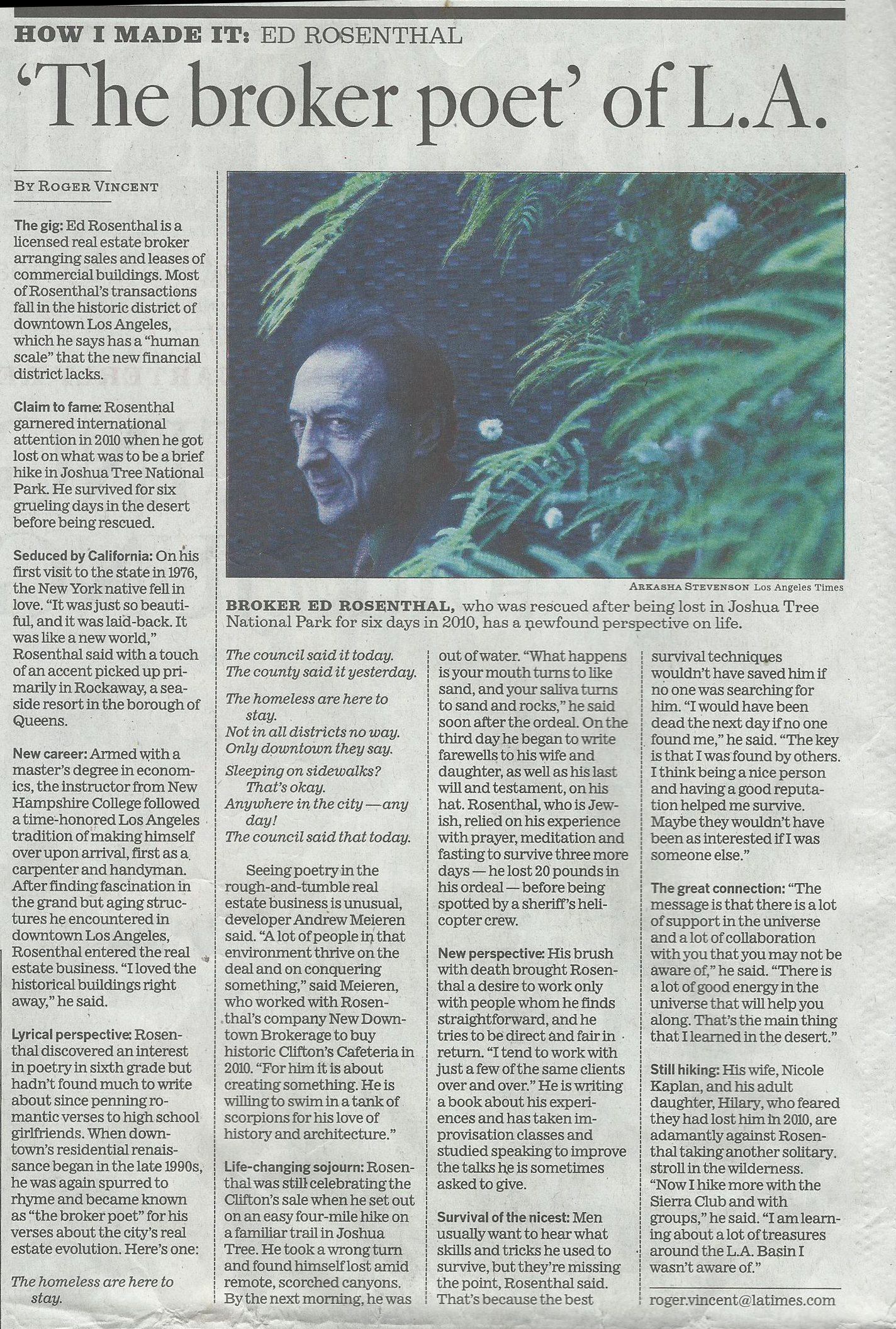 Below are a few articles I’ve collected since 1994 with my published poetry, many of which feature the character of the Poet-Broker. They include the Wall Street Journal, Los Angles Times, The Garment & Citizen, The Downtown LA News, and others. Also, one piece published in La Opinión about Broadway and the need to establish business Improvement districts to provide a foundation for development when Los Angeles City failed to provide security and sanitation.